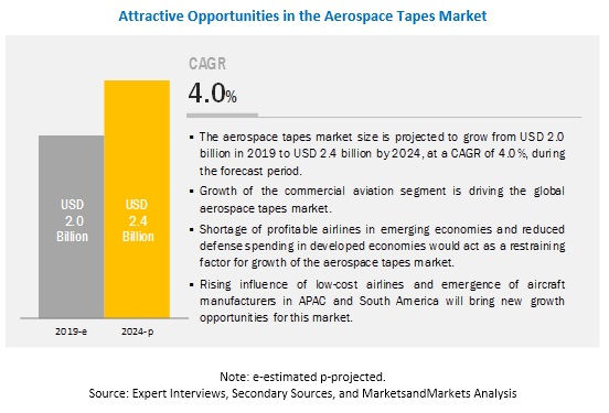 The aerospace tapes market is projected to grow from USD 2.0 billion in 2019 to USD 2.4 billion by 2024, at a CAGR of 4.0% between 2019 and 2024. The major driving factors in the aerospace tapes market are initiatives undertaken by governments of China and India, increasing demand for lightweight and more fuel-efficient aircraft, growing demand for passenger aircraft in emerging regions, and replacement of old/aging aircraft and modernization of existing aircraft.