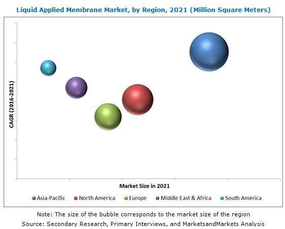 The liquid applied membrane market was valued at USD 14.42 billion in 2015, and is projected to reach USD 20.84 billion by 2021, at a CAGR of 6.3% from 2016 to 2021. Growth in this market is mainly attributed to the increasing demand for liquid applied membrane in the construction end-use industry.